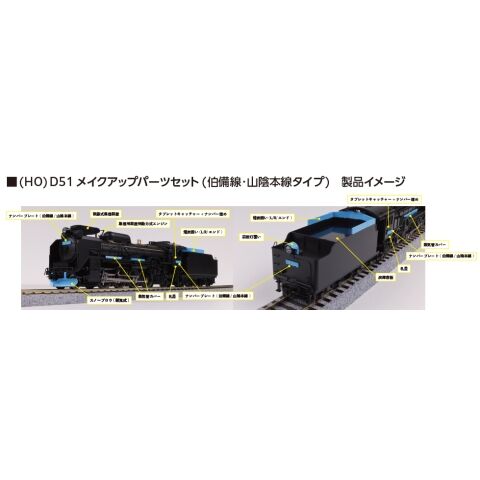 1-203 (HO) D51 標準量産形を地域や線区に応じた外観にディテールアップできる<メイクアップパーツセット>から第2弾として伯備線・山陰本線タイプが登場です。「布原の三重連」で人気を博した新見機関区所属機を再現可能で、特徴的な新見形のスノープロウやテンダーライトに施された前照灯覆いなどを付属いたします。