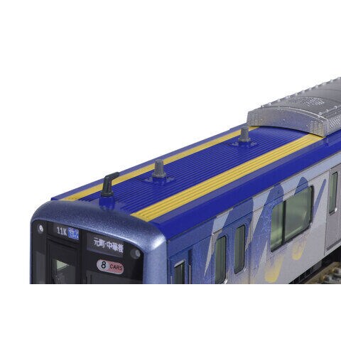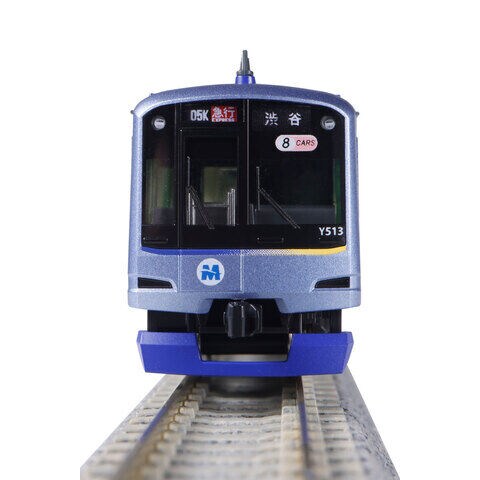 三菱製クーラー(CU708初期形)を搭載するY513編成を製品化 先頭車屋根上に増設されたデジタル無線アンテナ、IRアンテナが撤去された中間車(Y560)の形態を再現 副都心線対応の機器類を装備した先頭車の床下機器、元町・中華街向き/渋谷向き先頭車のスカート形態違いを再現 メタリックブルーの先頭部、車端部のブルーとイエローのグラデーションのM字デザイン、Mをモチーフとしたみなとみらい線のシンボルマークをリアルに再現 屋根上は側面のブルーの一番濃い箇所と同じ色調で再現。先頭車は屋根先端からクーラー部まで2本入る比較的幅広の黄色帯を再現 前面ガラスに掲げられた、8両編成を示す<8Cars>を印刷で再現 乗務員室脇の識別表示は赤色で再現 ヘッド/テールライト、前面表示点灯。白色LEDを採用 スロットレスモーター採用で、さらにスムースかつ静粛な走行が可能 前面表示「05K/急行/元町中華街(フルカラーLED仕様)」取付済。交換用として「21K/各停/渋谷」「11K/各駅停車/和光市」「(無地)」×2を付属 側面種別表示・行先表示は黒地表現、フルカラーLED表示を再現。行先表示シール(フルカラーLED仕様)付属