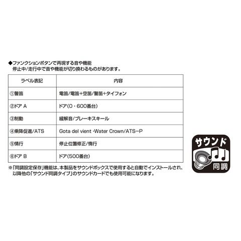 リアルなサウンドでE131系のコンパクトな編成を最大限に演出し、臨場感のある運転体験をお楽しみいただけます。 VVVF制御による走行音を収録。停車直前まで鳴動する電気ブレーキやブレーキスキールを鉄道模型で体験可能 0番台、600番台(房総地区、宇都宮・日光線)と500番台(相模線)で異なるドア開閉音をそれぞれ搭載 ファンクションボタン(1)にはオプションとして実車の1000番台が搭載する警笛を収録 ファンクションボタン(4)を押すことで乗降促進音2種も再生可能 サウンド同調タイプのカードは、走行音に追従した加速/減速で、実車を運転しているような感覚を楽しめます。 サウンドボックスの電源OFF時、直前の同調モードを記憶し、次回起動時も設定が維持される「同調設定保存」機能を搭載 パッケージ内にサウンドボックス対応の「ファンクションラベル」を同梱