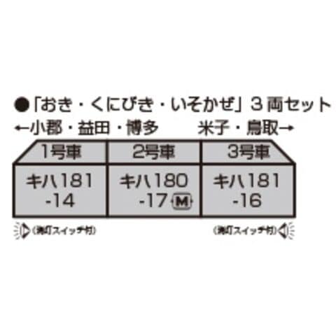 「おき・くにびき・いそかぜ」3両セットは1998年頃の後藤総合車両所属車を製品化 キハ181のタブレットキャッチャーが撤去され、列車無線アンテナ装備、非常用扉の閉塞、大窓化された中間車の貫通扉を再現 「おき・くにびき・いそかぜ」3両セットのキハ180は車掌室設置に伴い、小形化された客扉脇の側窓を再現 前面の特急マークは銀色で再現 国鉄特急色にJRマークがあしらわれた外観を美しく再現 各車両ともHゴムは黒色で表現 スロットレスモーター採用で、スムースかつ静粛な走行が可能 ヘッド/テールライト、愛称板点灯(消灯スイッチ付)。白色LED採用 先頭部・中間部ともボディマウント式KATOカプラー伸縮密自連形を標準装備。キハ181先頭部用の電気連結器付属 前面のヘッドマークは「おき」取付済。各列車を再現可能な交換用のヘッドマーク付属。(「くにびき」「いそかぜ」「いなば」「はまかぜ」「あさしお」「(無地)」) 各列車を再現可能な側面表示・サボを収録したシール付属 DCCフレンドリー 8両ブックケースに収納