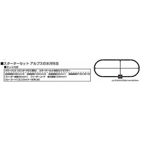 スイスを代表する観光列車「氷河特急」。その魅力ある姿をNゲージで手軽に始められるスターターセット 車両の仕様は品番10-2026「アルプスの氷河特急 基本セット(3両)」と同一 CV1エンドレス基本セット(半径R150)に、ユニトラックS248線路を2本追加とリレーラー線路をセットにした821mm×347mmの走行用ユニトラック線路。簡単手軽にご家庭のテーブルやデスクの上で、氷河特急が楽しめます。 パワーパックは電源グローバル仕様の「パワーパック スタンダードSX(黒色)」(専用ACアダプター付属)を採用