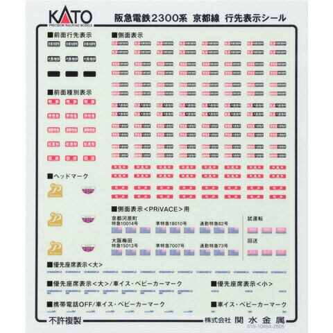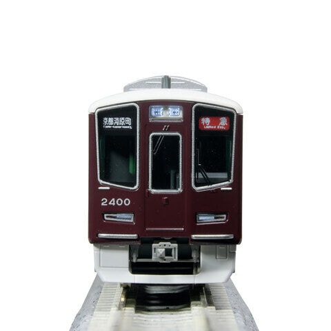 令和6年(2024)に運行を開始した2300編成を製品化 前面行先表示は「京都河原町/特急」を取付済。交換用前面表示として「大阪梅田/準特急」「無地」を付属。側面表示は黒色印刷。行先表示シール付属 切れ上がった形状の前面窓、標識灯、粒状のLEDヘッドライトを再現 ヘッド/テールライト、標識灯(両側)が点灯(白色LED採用)。ハイビーム点灯の4灯全点灯状態を再現 先頭車の昇降用ステップを表現 4号車の<PRiVACE>車両は、中央扉の両脇に小窓が並ぶ特有の窓配置、特徴的な形状の扉窓を再現 扉脇の側窓内に設置された行先表示、1+2列の特徴的な座席形状を再現 窓下、扉窓周囲に配された金帯、金色の車番・社章、<PRiVACE>ロゴを印刷で美しく表現 阪急特有の光沢のあるマルーン塗色をはじめ、窓枠や客扉、手スリ、靴ズリなど随所にアクセントとなる銀色を配した車体を表現豊かに再現 中間連結部は、ボディマウント密連形カプラー(フックあり)を採用。先頭部はダミーカプラー スロットレスモーターの採用で、スムースかつ静粛な走行性を実現 前面に掲示される<PRiVACE>ヘッドマークは行先表示シールに収録 DCCフレンドリー 8両ブックケースに収納