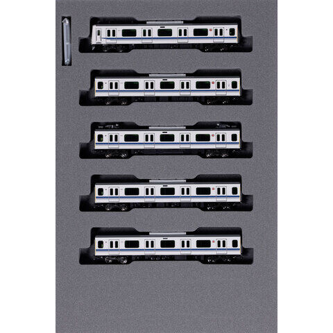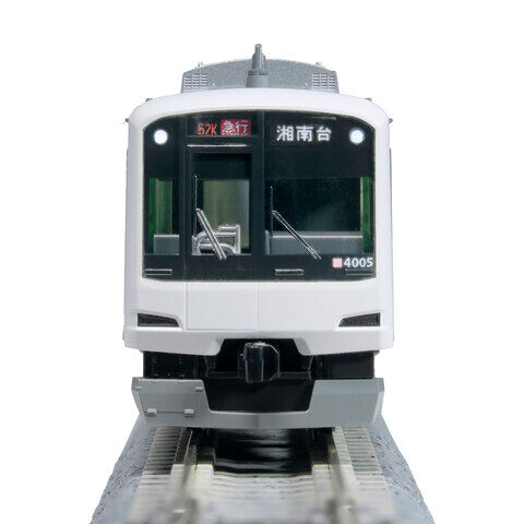 令和6年(2024)現在のラッピングが施された4105編成を製品化 新幹線ホワイトを基調に2本の新幹線ブルーの帯が巻かれた車体をフルラッピングで再現 連結面・車体裾・雨トイ部、各扉や窓枠はステンレス地で再現 先頭車屋根上に増設されたデジタル無線アンテナ、IRアンテナが撤去された中間車(4405)の形態を再現 編成中間部はKATOカプラー密連形(フックあり)を標準装備。先頭部はダミーカプラー装備 ヘッド/テールライト、前面行先表示点灯(白色LED採用) スロットレスモーターの採用で、スムースかつ静粛な走行性を実現 前面表示「52K 急行 湘南台」取付済。交換用として「53K 各停 川越市」「55K 急行 渋谷」を付属 側面表示は黒ベタ印刷。行先表示シール付属。お好みの行先を選択可能 8両ブックケース×2に収納