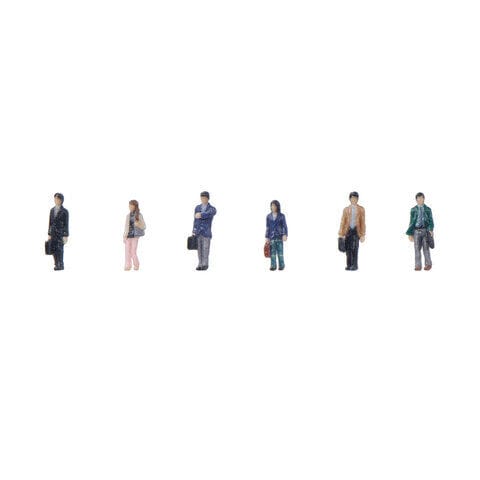 フルカラー3Dプリンターによる造形・彩色済み完成品 お好みにより、あるいは合わせてお使いいただける2つのカラーバリエーションで製品化 歩く人B:それぞれの個性による自由なチョイスでありつつも、調和を壊さない日本人らしさが感じられるコーディネイト 既存製品の「立っている乗客」、「座ってる乗客」、「歩いている乗客」などと組み合わせることで、駅や街中のシーンをよりリアルに再現可能。 それぞれ男性×4、女性×2(男性の一人は腕時計を見るポーズ、女性の一人はショルダーバッグ)