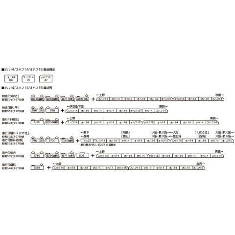 - スハフ14の緩急室側はアーノルドカプラー標準装備(交換用ナックルカプラー、交換用密自連形ボディマウントカプラー付属)。各車両の中間連結部は 密自連形ボディマウントカプラー装備