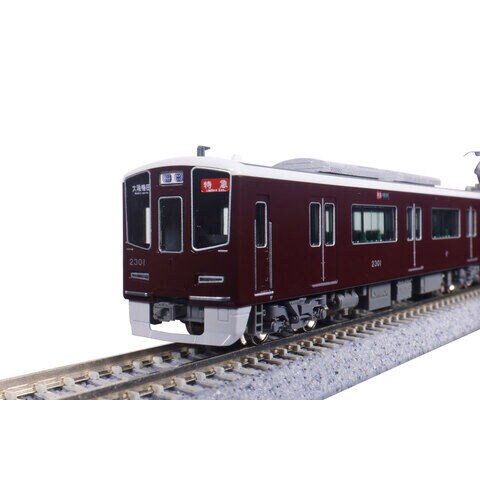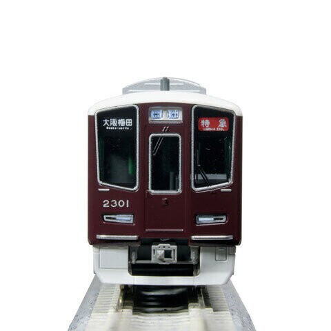 令和7年(2025)増備の2301編成を製品化 前面行先表示は「大阪梅田/特急」を取付済。交換用前面表示として「京都河原町/準特急」「無地」を付属。側面表示は黒色印刷。行先表示シール付属 切れ上がった形状の前面窓、標識灯、粒状のLEDヘッドライトを再現 ヘッド/テールライト、標識灯(両側)が点灯(白色LED採用)。ハイビーム点灯の4灯全点灯状態を再現 先頭車の昇降用ステップを表現 4号車の<PRiVACE>車両は、中央扉の両脇に小窓が並ぶ特有の窓配置、特徴的な形状の扉窓を再現 扉脇の側窓内に設置された行先表示、1+2列の特徴的な座席形状を再現 窓下、扉窓周囲に配された金帯、金色の車番・社章、<PRiVACE>ロゴを印刷で美しく表現 阪急特有の光沢のあるマルーン塗色をはじめ、窓枠や客扉、手スリ、靴ズリなど随所にアクセントとなる銀色を配した車体を表現豊かに再現 中間連結部は、ボディマウント密連形カプラー(フックあり)を採用。先頭部はダミーカプラー スロットレスモーターの採用で、スムースかつ静粛な走行性を実現 前面に掲示される<PRiVACE>ヘッドマークは行先表示シールに収録 DCCフレンドリー 紙箱に収納