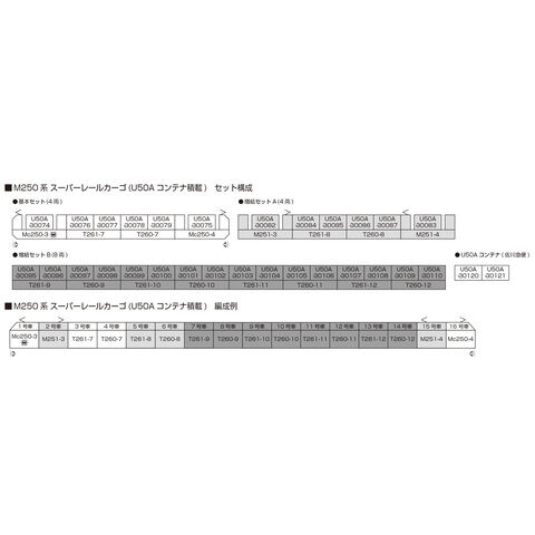 M250系の第2~第3編成を製品化 従来のU54Aに比べ背の低いU50Aコンテナを積載。ハローマークの相違も再現 車体ナンバー、車体表記類は印刷済 中間車のT260/T261はいずれもJRFマークのない形態を再現 中間車連結部のカプラーは KATOカプラー密連形を標準装備