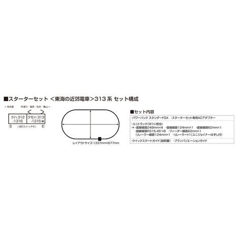クハ312-1316 クモハ313-1316(M) ユニトラックNゲージ線路:直線線路248 ×4・直線線路124 ×1・リレーラー線路124mm×1・直線線路62 ×1・フィーダー線路62 ・フィーダーコード×1・曲線線路R315-45×8 パワーパックスタンダードSX×1セット(スターターセット専用ACアダプター含む) リレーラー×1・ユニジョイナーはずし×1・線路クリーニング綿棒×1 クイックスタートガイド(説明書) プランバリエーションガイド