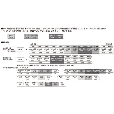 • 既存製品(3-515 24系 寝台特急「北斗星」 4両基本セット)とは異なる車番のスシ24 506/オロハネ24 552を製品化