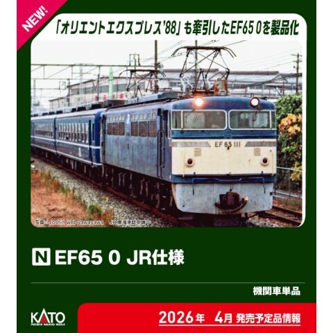 JR移行後~平成2年(1990)頃のEF65 0を製品化 前面にヘッドマークステーあり、側面に描かれたJRマークを再現 前面通風口が車体に設置され、大形の誘導員手スリ、前面ステップが幅広、赤色板 非対応の標識灯の形状、スカートの誘導員用ステップが機関士側のみの4、5次車を再現 列車無線アンテナ搭載。避雷器はLA15(灰)、Hゴムグレー、屋根上は青色の外観で再現 スロットレスモーター採用で、スムースかつ静粛な走行性を実現 前照灯点灯、ライトユニットLEDは電球色を採用 アーノルドカプラー標準装備。交換用ナックルカプラー付属 選択式ナンバープレート:「106」「110」「111」「112」、メーカーズプレート:「東洋・汽車」「日車・富士」 クイックヘッドマーク対応。「金星」「ユーロライナー」のヘッドマークを付属