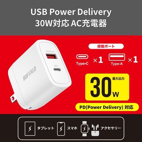バッファロー PD30W対応 AC充電器 2ポート C×1/A×1 (ホワイト) BSACPD3000C2WH 【返品種別A】