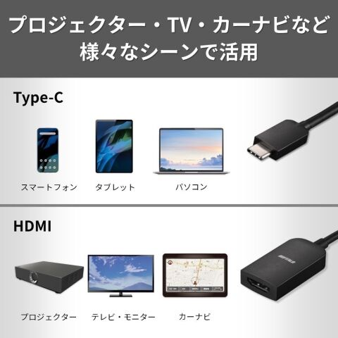 - 対応機器:映像出力可能なType-C端子(DisplayPort over USB Type-Cに対応した端子)搭載のパソコンやタブレット、HDMI端子を搭載した液晶ディスプレイやプロジェクターなど ※全ての組み合わせでの動作を保証するものではありません。環境により正常に動作できない場合があります。