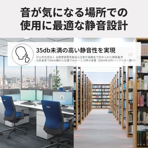 ※防音室で50cm離れた位置でのキー入力時の音量が、公益社団法人 全国家庭電気製品公正取引協会で定められた静音と定義される一般的な騒音レベル 35db未満を満たすことを確認(2024年10月、バッファロー社調べ 当社テスト値につき保証値ではありません)