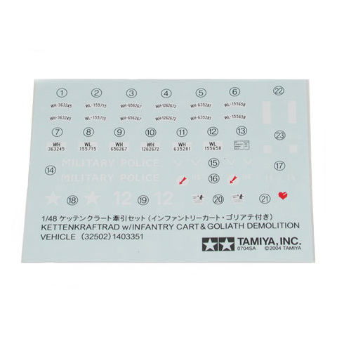 全長64 (ケッテンクラート本体) 歩兵用装備品を運搬するトレーラー「インファントリーカート」と自走式遠隔操作爆薬「ゴリアテ」とその専用トレーラーもリアルに再現。 インファントリーカートに搭載される装備品も手榴弾ケースや機銃弾薬箱、ジェリカンなどに加え、モーゼルKar98kライフルと2種類のパンツァーファウストもモデル化。 ドラム缶もセットされ、豊富なアクセサリーが情景製作の楽しみを広げます。 ドライバーの人形1体と陸軍や空軍など、デカールは5種類を用意しました。