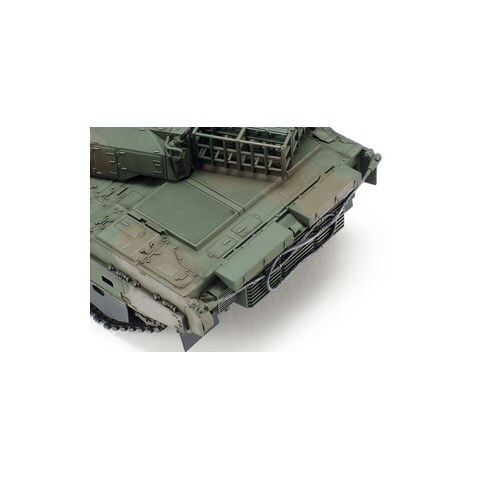 1/35の10式戦車と異なるウインカー・ライトまわりやマッドガードも見どころ。連結組み立て式の履帯は最新仕様をリアルに再現しました。