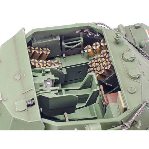 オープントップの戦闘室内部は砲弾ラックや薬きょう受け、無線機、車載機銃など多彩な装備品で見どころ満点。