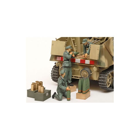 • 砲弾を搭載する兵士、車上から声をかける兵士、そして砲弾を手に振り返る兵士の人形3体をセット。装薬ケースや弾薬箱などのアクセサリーパーツも豊富に用意。