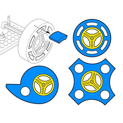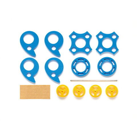 ブルーカラーのタイヤと対照的な、イエローカラーのホイール4個と3×100mm六角シャフトも1本ついています。