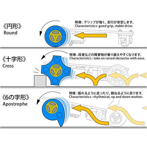 また、各タイヤには内側に丸形や台形の抜き穴があり、取り外すことでタイヤの硬さを調整できます。