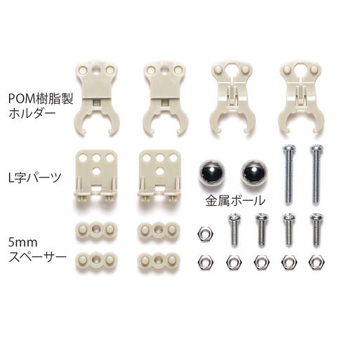 直径10.3mmの金属ボール2個に加えて、L字パーツや高さ調整用5mmスペーサー、取り付け用ビス・ナットもセット