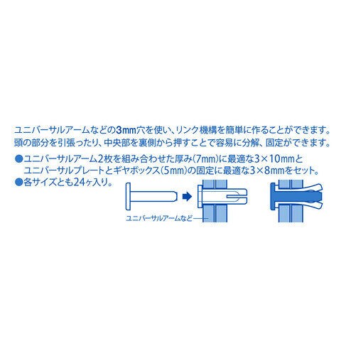 プッシュピンとストッパーで構成され、3mmの穴にストッパーを入れておき、プッシュピンを差し込んで固定。