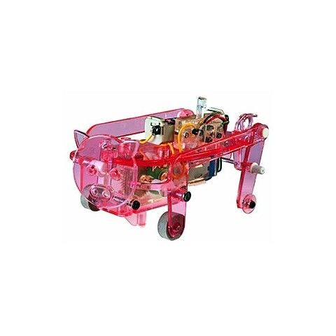 足の動きに合わせて首を左右にふりながらチョコチョコ歩くブタ型ロボットの組み立てキットです。モーターの回転をギヤボックスで減速してクランクアームを使って前足を動かし、リンクプレートと一体になった前足が後足に動きを伝えます。足の回転スピードは速く、歩幅が狭いので、足を忙しなく動かしていてもあまり進まないユーモラスな動作がとても愉快です。