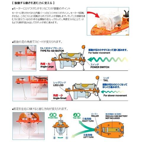 3本の金属製の足(レッグロッド)をこまかく振動させて、滑るように進む3匹のロボット工作キットです。