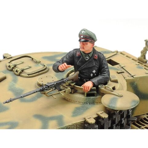 全長241.5mm。 ペリスコープ付きのキューポラや砲塔保護リングの無い車体など、中期生産型の特徴を確実に再現。 数多くのゴム縁付き転輪を重ねた独特の足まわりを立体感豊かに再現。一枚ずつ組み立てる連結式キャタピラと共に重厚な仕上がりです。 搭乗員用などの各ハッチは開閉選択式。砲塔内には88mm砲の装填部も再現しました。 車体に装着される工具類も繊細な仕上がり。 車体後部には88mm砲のトラベルロックもパーツ化。 戦車長の人形一体付き。