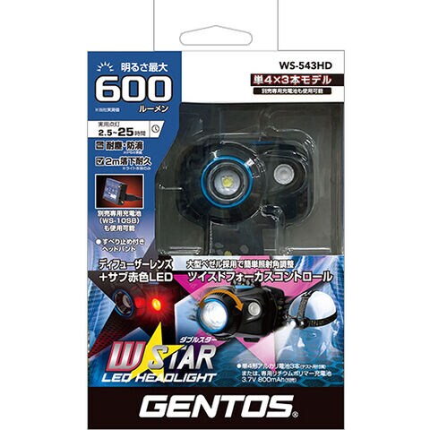 ジェントス アルカリ乾電池/専用充電池兼用 LEDヘッドライト 600ルーメン GENTOS W STAR シリーズ WS-543HD 【返品種別A】
