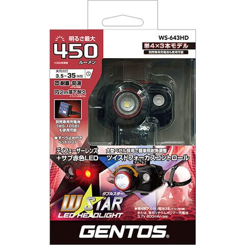 ジェントス アルカリ乾電池/専用充電池兼用 LEDヘッドライト 450ルーメン GENTOS W STAR シリーズ WS-643HD 【返品種別A】