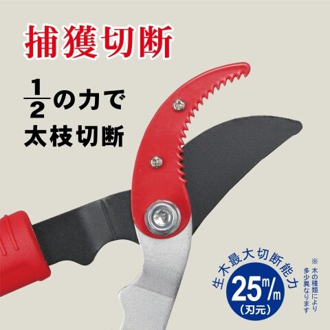◆エッジ式捕獲式切断効果により1/2の力で太い枝も切断。