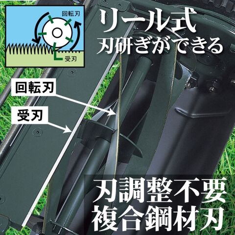 ◆刃研ぎができるリール式、刃調整不要の複合鋼材刃。