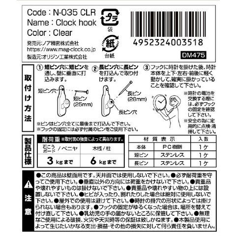 時計 掛け時計 ノア精密 掛け時計用ボード掛けフック N-035 CLR 【返品種別A】