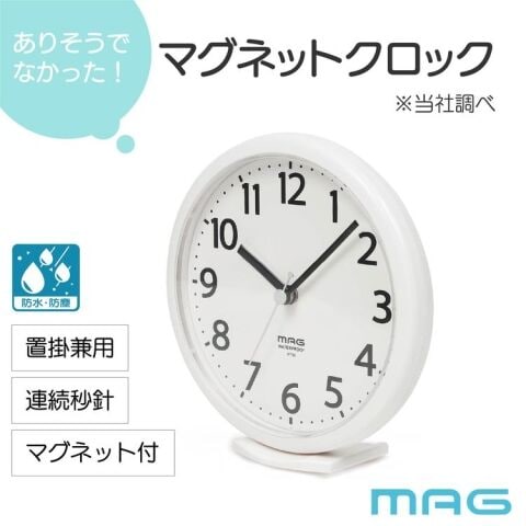 - 機能:連続秒針、生活防水防塵(IP54)、置掛兼用、マグネット