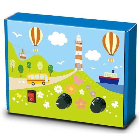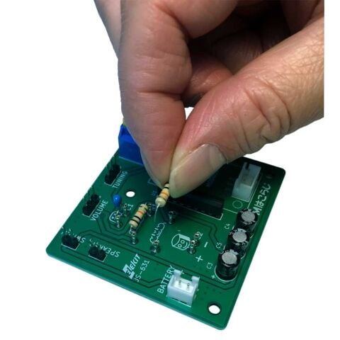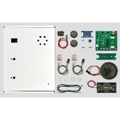 工作キット 難易度:1(5段階中) 工作時間:1時間程度 対象年齢:8歳~ はんだ付け:なし 部品点数:21点 使用電池:単3乾電池×2本(別売) 消費電流:約35mA(ボリューム位置中間時) 本体サイズ:W210×D50×H160mm(アンテナ含まず) 受信周波数:76 MHz~108 MHz 出力:スピーカ、モノラル