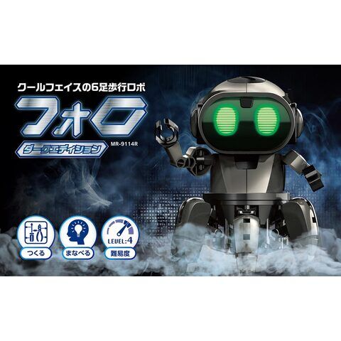フォロダークエディションは、緑に光る目と音のギミックが特長の、足歩行ロボットの工作キットです。
