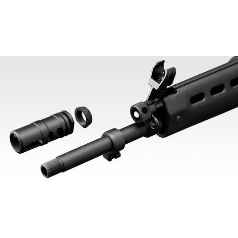 フラッシュハイダーを取り外せば、サイレンサーなど14mm逆ネジ仕様のマズルオプションを取り付けることができます。