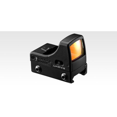 光学サイト 20mm幅マウントレイル対応 ルビーコート樹脂レンズ採用 全長 : 48 mm 重量 : 16 g(本体のみ / 電池含む) ドット : カラー:赤、輝度:2段階 動力源 : CR2032リチウムコイン電池1個(※1) パッケージサイズ : 横91 x 縦140 x 厚55 mm