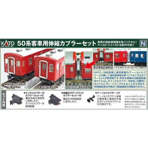 ホビーセンターカトーのAssyパーツ。50系客車用伸縮カプラーセット(基本セット対応)です。交換補修用にどうぞ。