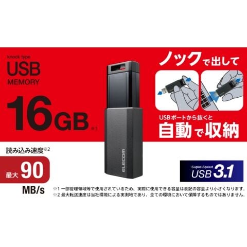 エレコム|ELECOM USBメモリー USB3.1(Gen1)対応 ノック式 オートリターン機能付 16GB(ブラック) MF-PKU3016GBK 【返品種別B】