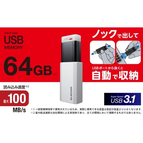 エレコム|ELECOM USBメモリー USB3.1(Gen1)対応 ノック式 オートリターン機能付 64GB(ホワイト) MF-PKU3064GWH 【返品種別B】