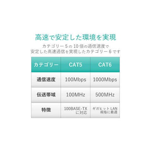 • 規格:Cat6準拠(1000BASE-TX/1000BASE-T/100BASE-TX/10BASE-Tに準拠)