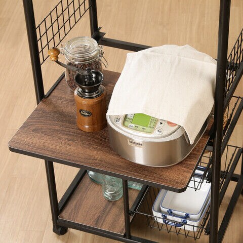 炊飯器やポット、カトラリーまで様々なものを収納できます。木目調天板とスチールの組み合わせでお洒落なナチュラルデザインです。
