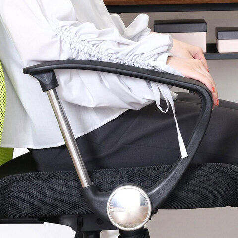 メッシュ素材で圧迫感がなく、ヘッド部分や肘置きをブラックで引き締めたデザインです。