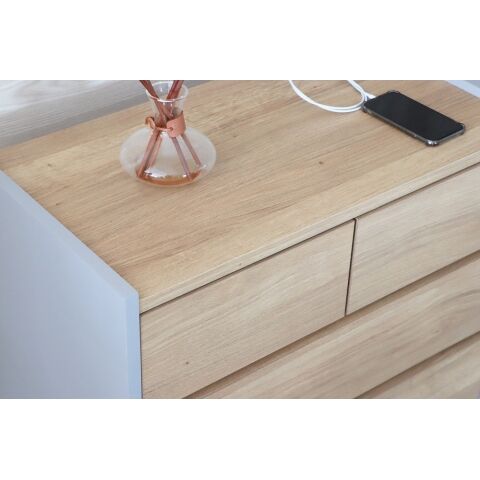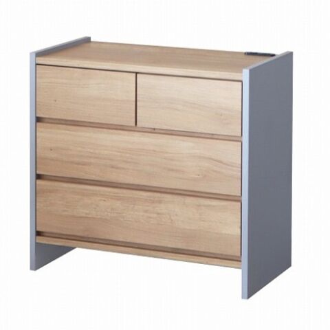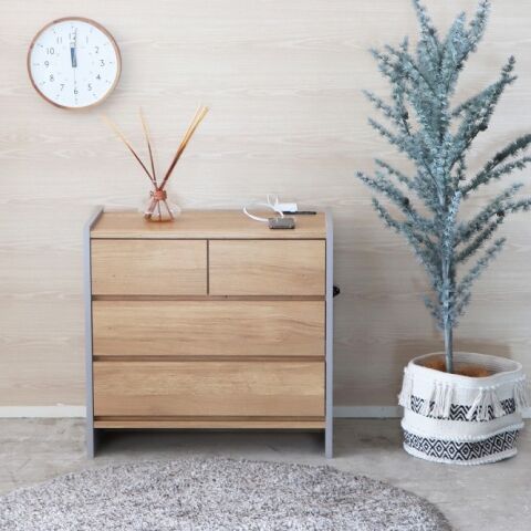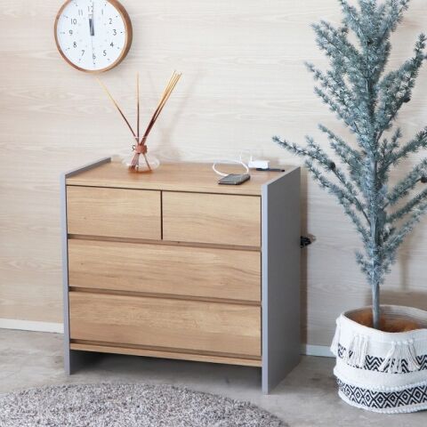 側面にはアクセントとして流行のグレーを取り入れたくすんだイメージのナチュラルチェスト、引出しは大2、小2と収納力もあり、お部屋にくすんだ色合いを取り込めるチェストです。