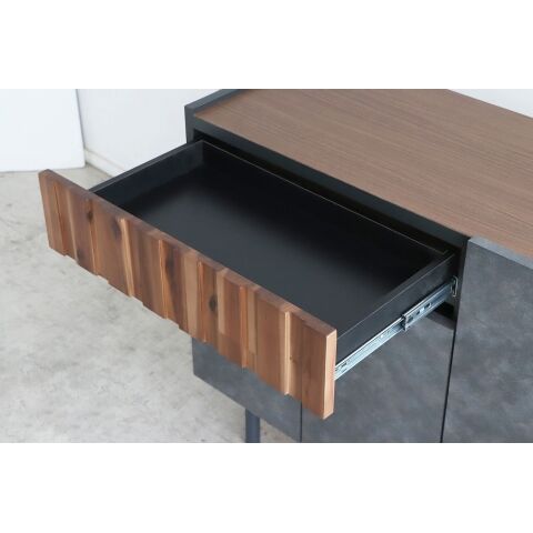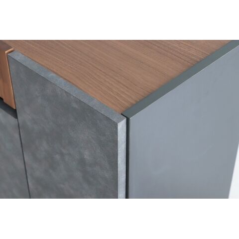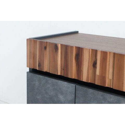 モルタル調の前板とブラウン木目が特徴的な家具シリーズ。