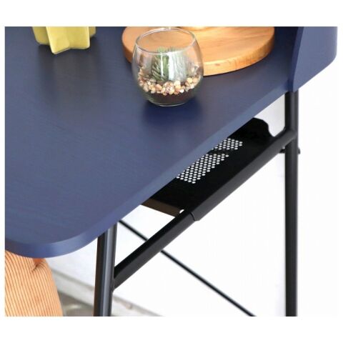 出し隠しができる配線穴、天板下には広い収納スペース、ちょどいいサイズ感で作業を快適にしてくれるシンプルデスク。