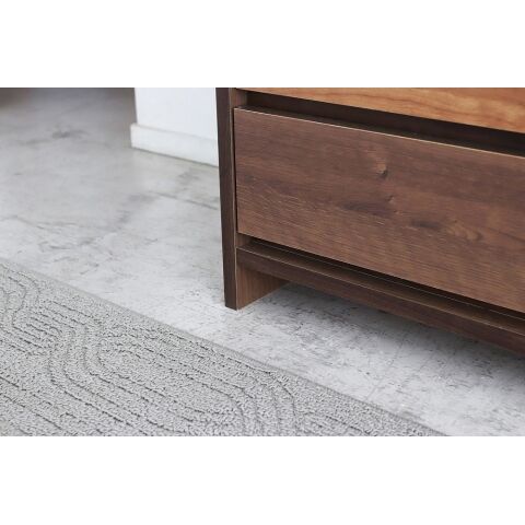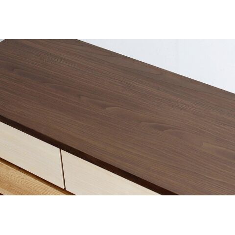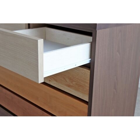 あえて違う木材カラーをグラデーションになるように設えた意匠性が一段と目を惹く大容量の収納チェスト。