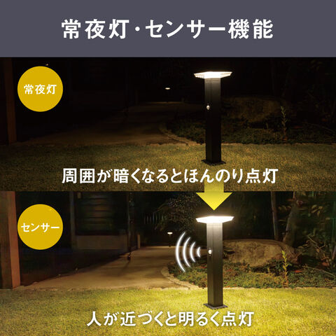 周囲が暗くなると自動点灯し、人が近づくとさらに明るく点灯するセンサー機能付き。