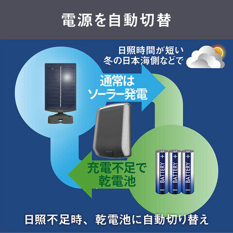 日照不足によるソーラー発電不足(充電不足)になると、自動的に乾電池から電源供給しソーラー式ながら安定した点灯を実現した製品です。